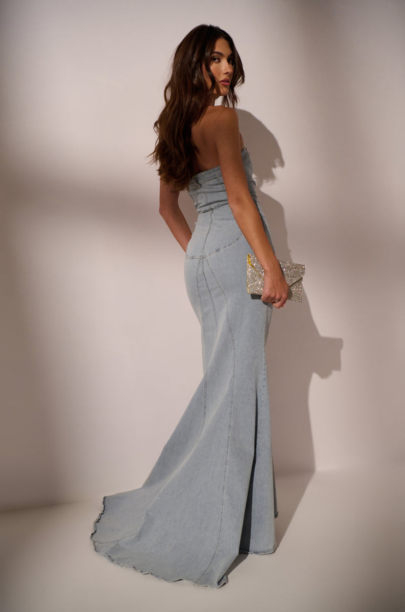 The AKIRA Label Call Me Britney Denim Maxi Dress is a semi-stretchy. light wash denim number featuring a cotton blend composition. a strapless design with a jean waistband-inspired neckline. belt loop accents. a paneled construction with elongating body seaming. and a sultry bodycon fit. Complete with a maxi length silhouette. a mermaid hemline that extends at the back. and a front zip closure with a button fastening at the chest.